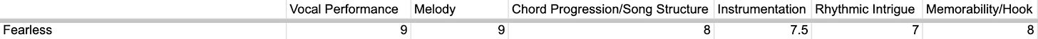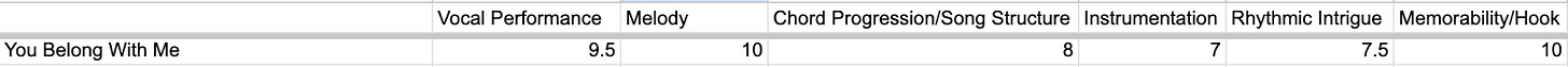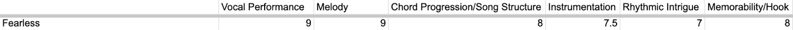For my cumulative rankings so far, I’ll bold the ones that are new so you can see the changes. I also included two singles, both released in 2008: “Beautiful Eyes” and “I Heart ?”. I only included songs that Taylor Swift has both writing credit, and a recording where she appears vocally on the track. It was a little ambiguous which era to include certain singles into, so I decided to move some of them into the Speak Now era next week since Fearless already has so many songs to cover.